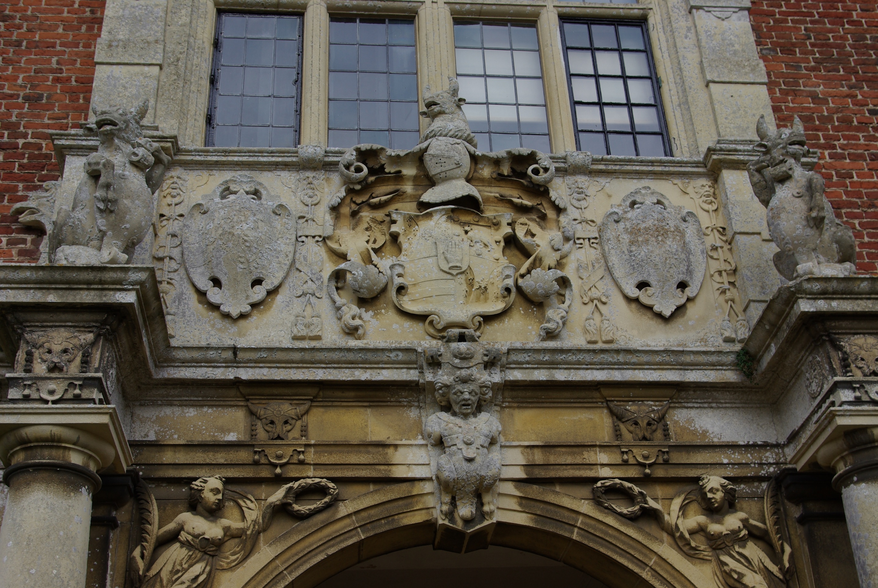 The house is huge, and ornately done, which seems common for Jacobean manor homes. There are sculptural and relief elements crests on the exterior of the home as well as ornately done fireplaces and ceilings on the interior. Upon entering, you find yourself in a large room with a great deal of wood paneling and the large staircase that splits to go up to each side of the upper floor.