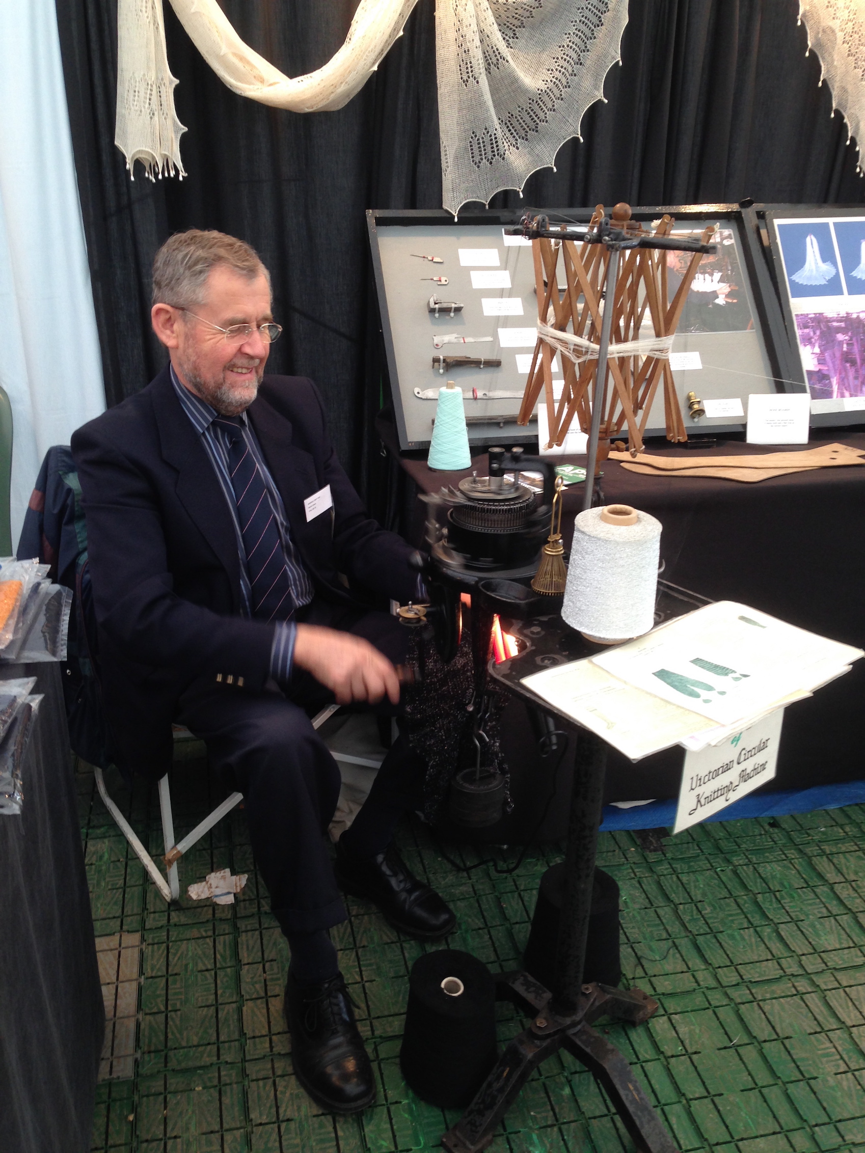 The beautiful handmade lace was made by a gentleman on a Victorian style machine (You can see samples hanging behind him in the photo below). He also used a knitting machine from the same era to make some lovely delicate scarves.