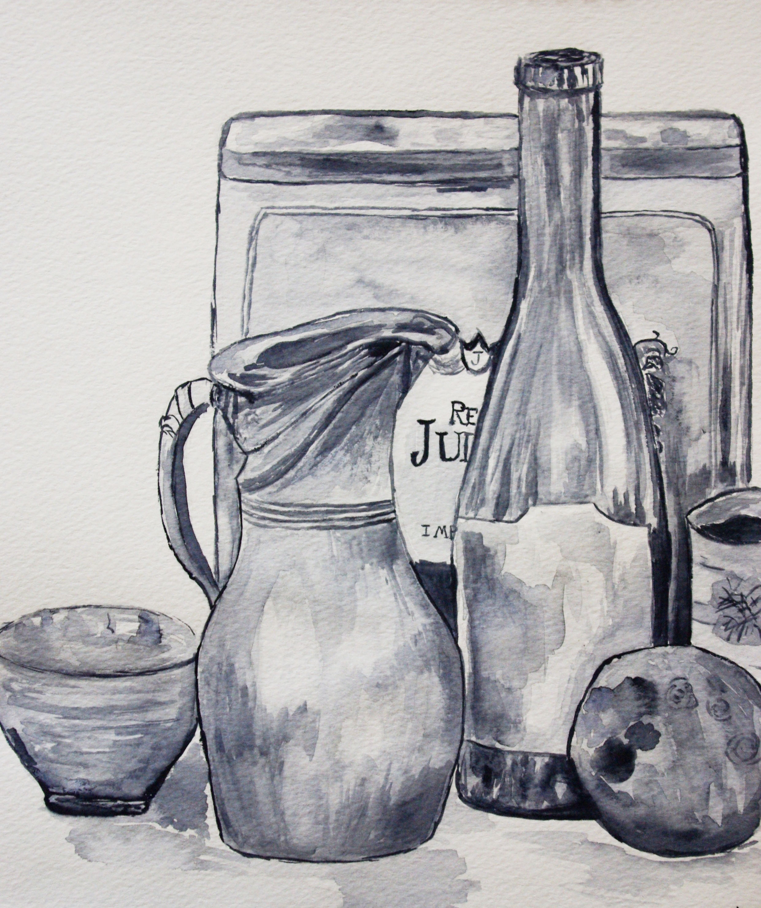 Still life:Monochromatic -2012When Darcy attends Lizzy’s show, we know his internal impressions of Lizzy’s work. Those were from a description of my watercolour instructor used for a still life I had to paint early in her first class. It was a simple monochromatic arrangement, but I was always happy with how it turned out–especially the wine bottle! It had been years since I had really painted and I was so excited to be doing it again. That semester, I had to paint several compositions dictated by the instructor, but I discovered when I tried the landscape that I was better at it than I thought. I assumed it would be terrible (I’m not completely happy with all of the background, but I was really happy with most of it). Then, we were allowed to finish the class with two paintings from any genre, and I chose landscapes for those as well. This was how I discovered that I enjoyed painting landscapes, which is why Lizzy enjoys landscapes.