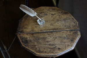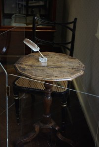 We returned to Chawton on Tuesday when I was able to tour Jane Austen’s house. The experience for me was extremely moving–particularly her writing table. I could not help but take a photo of the table and her chair, but also the top, which has some small holes and is very dark, almost indicating a good deal of ink made it to the table itself.