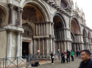 From the Rialto Bridge, the Piazza San Marco is not far and is one of the main sights of Venice, containing Saint Mark’s Basilica and Doges Palace as well as a few other sites. Our first stop was Saint Mark’s, an Italo-Byzantine church completed in 1092! We’d heard it was a must see and was free to enter, which was lovely. My complaint was it was dark. Not so dark you couldn’t see, but I really would have liked to see the mosaics (Not just regular mosaics either! The background is gold glass tesserae-gold leaf encased in layers of glass.), which cover the wall in more detail, and it was really impossible to see all I wanted. Given the windows in the ceiling, I am certain a bit of it was the poor weather and the time of day since we toured near 5 pm, but we had poor weather both days in Venice. No matter what, our experience would have likely been the same. My other complaint–we weren’t allowed photos.