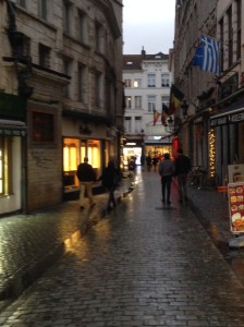 Brussels was larger than I expected, though a lovely town. We stayed in Grand Place, where there you have a choice of a number of hotels as well as touristy shops for entertainment. We arrived late afternoon, settled into our room, and then decided to walk around and look for a place to eat.