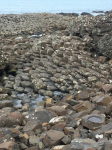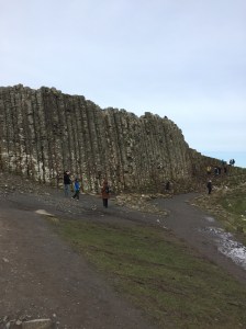 The next day, we drove out to the coast and Giants Causeway, a formation along the coast comprised of interlocking Basalt columns that form along the water what could be large steps. A result of volcanic activity 50 to 60 million years ago, Giants Causeway is a UNESCO World Heritage Site and a wildlife refuge. These basalt steps extend in places out in the water and you can walk along them–except you can’t go too far out. The National Trust has employees who ensure no one gets to close to the end of some of the extensions. Not only can you walk on these amazing formations, but you can continue to walk along the trail where there are more basalt columns that extend into the hills and cliffs around the beach.