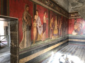 Villa of the Mysteries is named for the hall of the mysteries in the portion of the house that faces the sea. This too, located in the residential portion of the building, has a fresco covering three walls that is absolutely incredible. It is one of the most preserved ancient buildings, depicting a scene of Dionysus, who is on the middle wall, joined by Ariadne, his wife. Other scenes involve rituals as well as architectural details common in the art of Pompeii and Herculaneum. The building dates back to 200 BCE while the frescos are closer to 70 to 80 BCE.