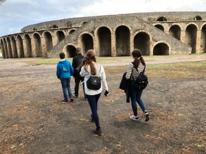 After, the children wanted to see the amphitheatre, so we zig-zagged through the maze of buildings, marvelling at the ruts from carriages visible in the roads and the strategically placed stones allowing people to cross the streets, which were a good one to two feet below the sidewalks.